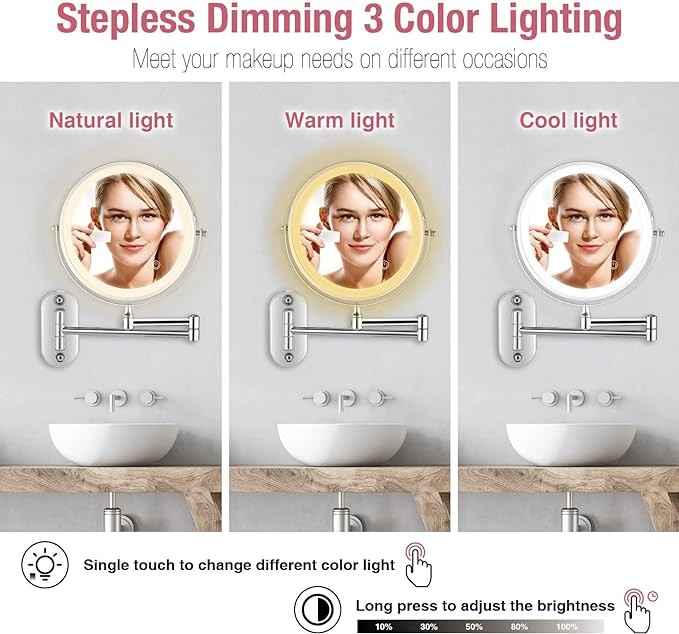Stepless Dimming and 3 Color Lighting: This vanity mirror provides natural light,warm light and cool light for you to choose,You can apply 3 different settings for different lighting effects,Just touch to choose your lighting preference.Easily change light patterns by single touch switch and long press to adjust the brightness to meet your makeup needs on different occasions.