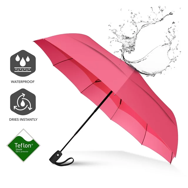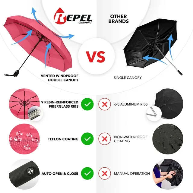 You never know what Mother Nature has in store — always be prepared with the Repel Travel Umbrella. Built to withstand the elements, the black umbrella features 9 reinforced ribs that are sturdy, durable, and tough; keeping you protected through the heaviest of rain, snow, and wind. Color Black & White. Unlike other umbrellas that turn inside out and break during high winds, our automatic umbrella is designed with a Teflon coated double vented canopy that gives, not breaking or inverting. Compact and lightweight measuring 11.5 inches long and weighing less than a pound, this cute umbrella is suitable for adults and kids alike. At the push of a button,the small umbrella opens and closes automatically, perfect for one-handed operation. Plus, the rubberized non-slip handle and wrist strap make it even easier to carry. Perfectly fits inside backpacks, briefcases, purses, luggage, and car glove compartments.