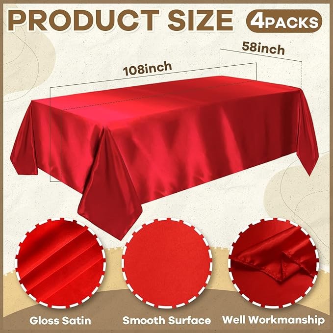 Size & Color - Satin Table Cover:With 4 packs of red satin tablecloth in each package, each satin rectangle tablecloth is about 58 inch wide and 108 inch long, large enough to decorate a table accommodating about 8-10 persons, providing a comfortable and elegant dining environment for your guests.