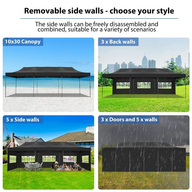 10x30 feet shade area ? Heavy-duty frame is strong and stable ? Pop-up design for quick installation ? 8 side walls in various shapes ? 3 height adjustments ? A full set of rich accessories ? Suitable for all seasons