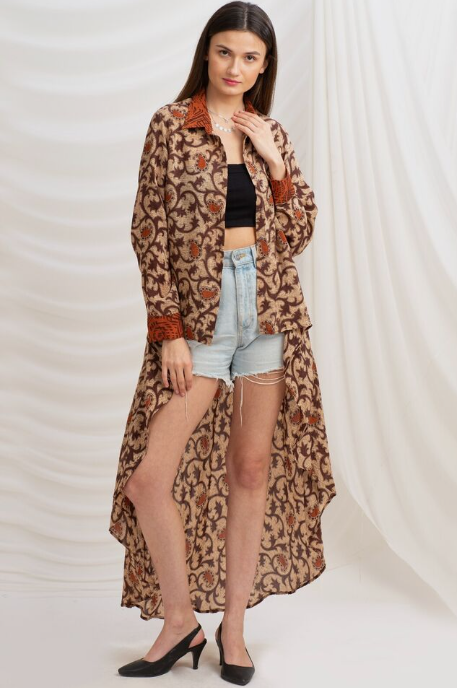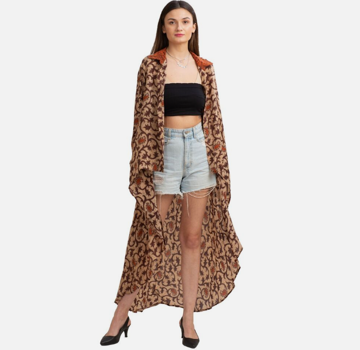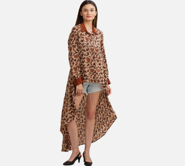 Sanskriti Vintage High Low Shirt Dress Pure Crepe Silk, Upcycled Free Size