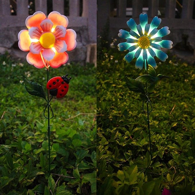 ?[Newly upgraded Solar]:4 pack metal outdoor flowers garden stakes decorative made from high grade rust-proof. It's as beautiful as a real flower during the day, and at night it automatically gives off a warm glow to decorate your garden, patio, backyard, yard, porch, and walkway.