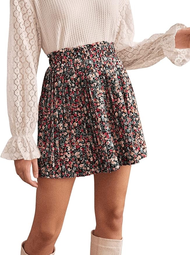 SweatyRocks Women's High Waist Mini Pleated Skater Skirt Flared A-Line Floral Short Skirt