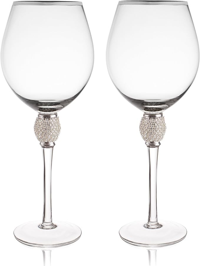 DECORATIVE DESIGN: Diamond like rhinestones detail the top of the stem and silver details the clear glass rim to create a stylish finish that makes any occasion special.