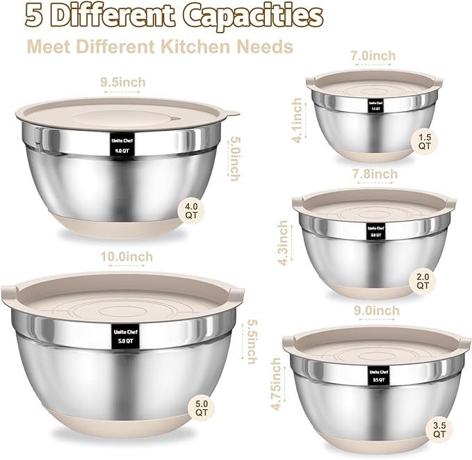 AIRTIGHT BPA FREE LIDS & 5 SIZES BOWLS: The range of sizes from 5QT down to 1.5QT, makes this set incredibly versatile and suitable for a wide range of tasks. Each bowl comes with a QT label to make it easier to choose the right size. The airtight lids that come with this mixing bowl set make it easy to store ingredients and leftovers to Keep your food fresh for longer without worrying about spills or leaks. Bowl sizes fit on standard-size refrigerator shelves and cabinets.