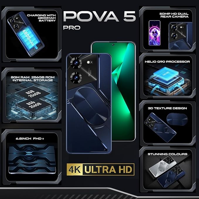 Under the hood, the POVA 5 Pro boasts the formidable Helio G90 Deca-Core processor, complemented by a generous 8GB of RAM and 256GB of internal storage. This combination delivers lightning-fast performance and ample space for all your apps, photos, and games.