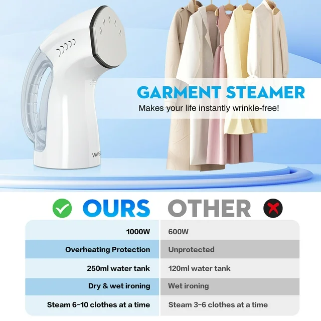• UNIQUE LEAK-PROOF DESIGN - VAVSEA-S007 1000W steamer for clothes with unique leak-proof technology is designed to allow you to steam from any angle. Gently iron many different kinds of clothes, including silk, lace, organza, cotton, linen, nylon, denim, wool, etc.