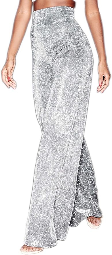 Sparkly Glitter, Elastic High Waist, Much Stretch, Wide Leg Long Pants. Zipper closure on the back.