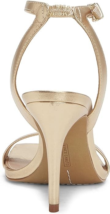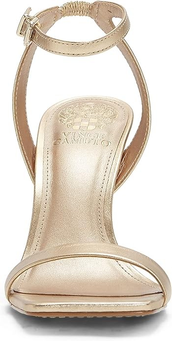 • Open square toe; toe and ankle strap; covered stiletto heel