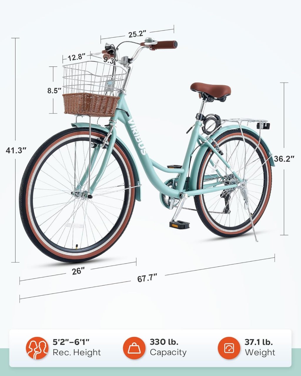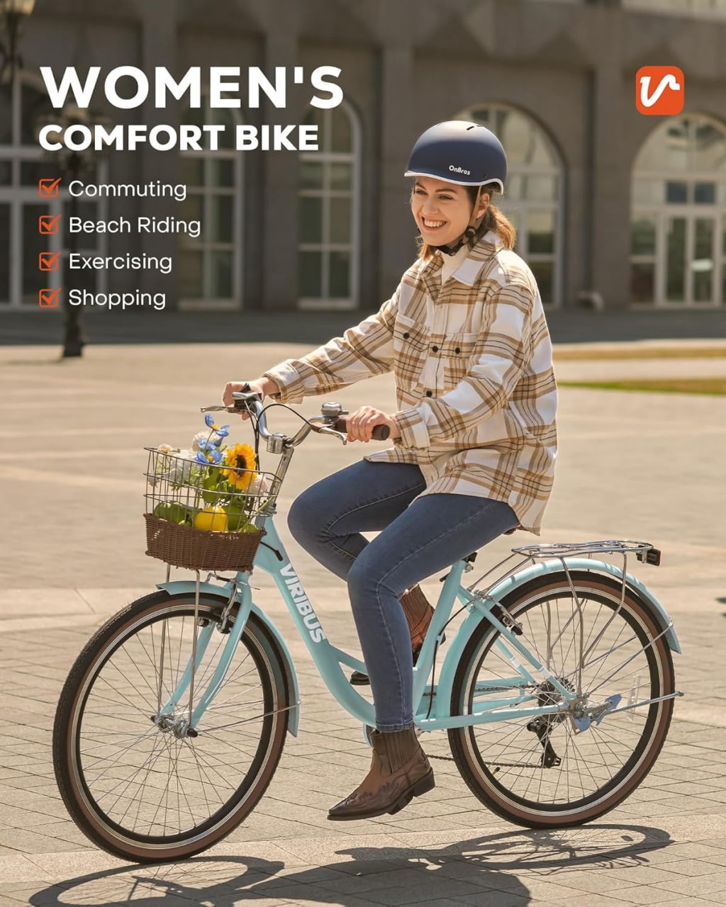 7 Speed Womens Bike: Equipped with a 7-speed derailleur and user-friendly thumb shifters, this cruiser bike ensures smooth and precise gear changes for stable rides on various terrains, from city streets to winding trails