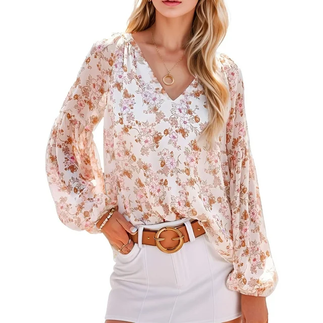 Fashion Boho Floral Shirt for Women Summer Casual. Sexy V neckline, long sleeve top for women,Casual loose fit womens tops.