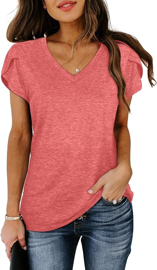 WIHOLL Womens Tops V Neck Summer Petal Sleeve Casual Tshirts