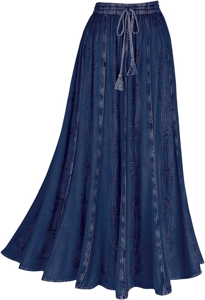 Women's Floral Embroidered Maxi Skirt-Over-Dyed Long Peasant Skirt, Ankle Length