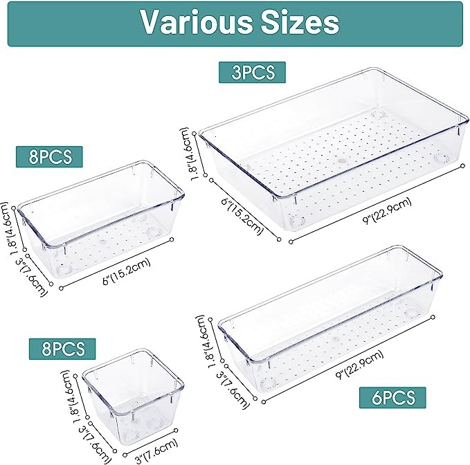 Premium Material:The drawer organizer is made of plastic which may be safely used. The transparent design makes it easy to find what you need quickly.