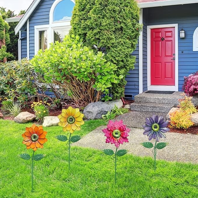 • 【BRIGHT UP YOUR GARDEN】- This adorable 4 set of Garden Stakes will add the perfect charm to your planters, raised garden or landscape beds. Each Whimsical flower measures approximately 5.5 inches(DIA) and stands 20 inches tall. Vibrant metal flower set will bring a boost of color to any yard or garden! Guests in your garden won't be able to miss these beautiful and unique shining metal flower garden stakes!