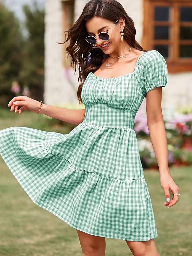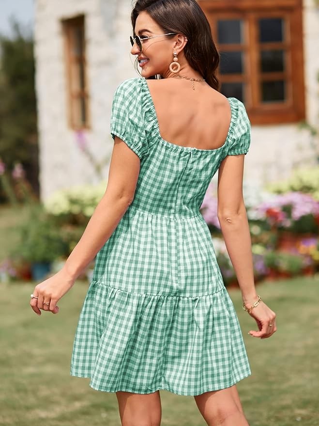 ZAFUL Women's Casual Plaid Mini Dress Scoop Neck Short Puff Sleeve Sundress A-Line Flowy Summer Dresses