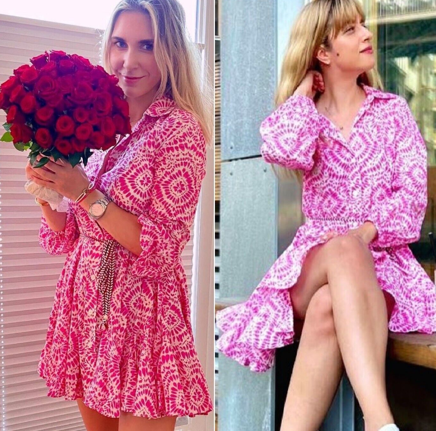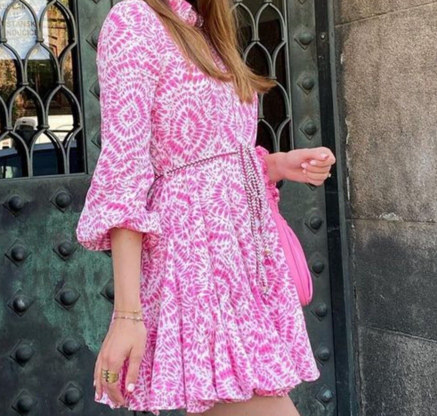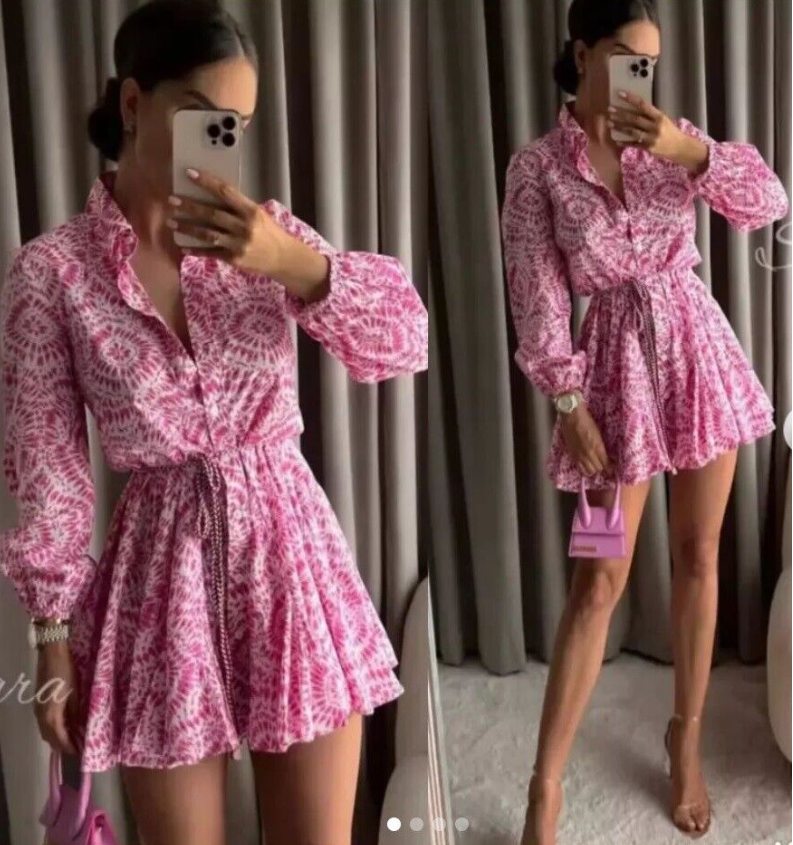 ZARA PINK TIE DYE FLORAL PRINTED MINI SHIRT DRESS VOLUMINOUS RUFFLE SKATER SKIRT