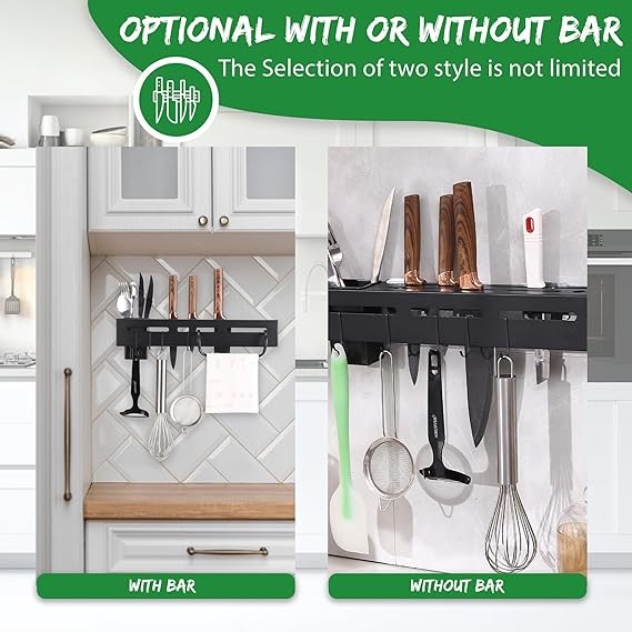 Utensil Rack: Kitchen utensil organizer is Stainless Steel, Water Proof, Rust Proof, High-Temperature Resistance, Resist Scratches. it can bear 33 pounds, The Utensil Rack consists of a movable Spoon Organizer, a Detachable Towel bar, 4 Detachable and movable hooks, a Sharpening Stick, Scissors Hold, Big Knifes, and Small Knives. with all of these features you can cook without worrying about your kitchen cleaning and open every drawer to search for knives and spoons and return them after washing. you have an All-In-One kitchen utensil organizer