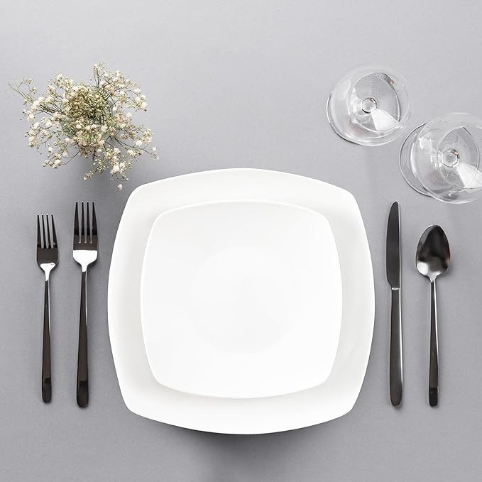HIGH-QUALITY PORCELAIN: This sophisticated, premium-quality white dish set has the right balance of weight and size, making family mealtimes extraordinary for years to come. Our square dinnerware set is microwave and oven safe, making cooking simple and quick. Note: Handle with care, as the plates and bowls can get hot when placed in the microwave.